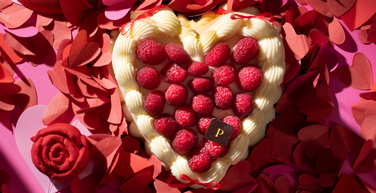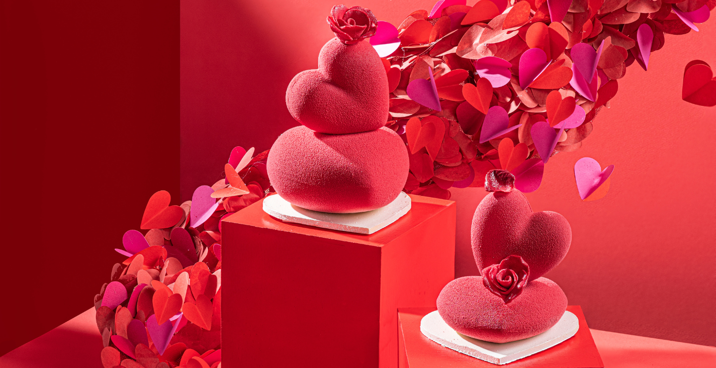 Chocolate creations shaped like hearts and roses, macarons filled with patisserie cream and strawberries, signature chocolate and strawberry mille-feuille, tarts, chocolate brownies and many more sweet treats come together in shades of red with subtle golden accents.